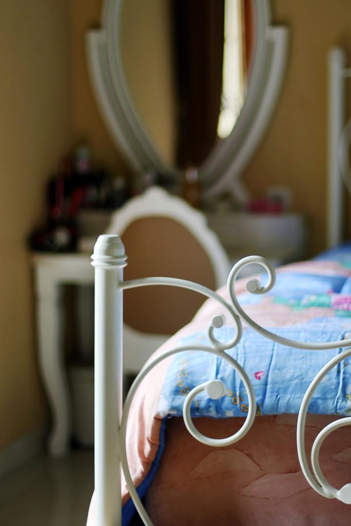 Kami memberi sentuhan ornamen besi ukir dengan finishing putih pada kasur Gaby. Tidak hanya itu, beberapa sentuhan duco juga kami berikan pada beberapa sudut dan furnitur ruangan, untuk memberi rasa semi-klasik yang memikat.