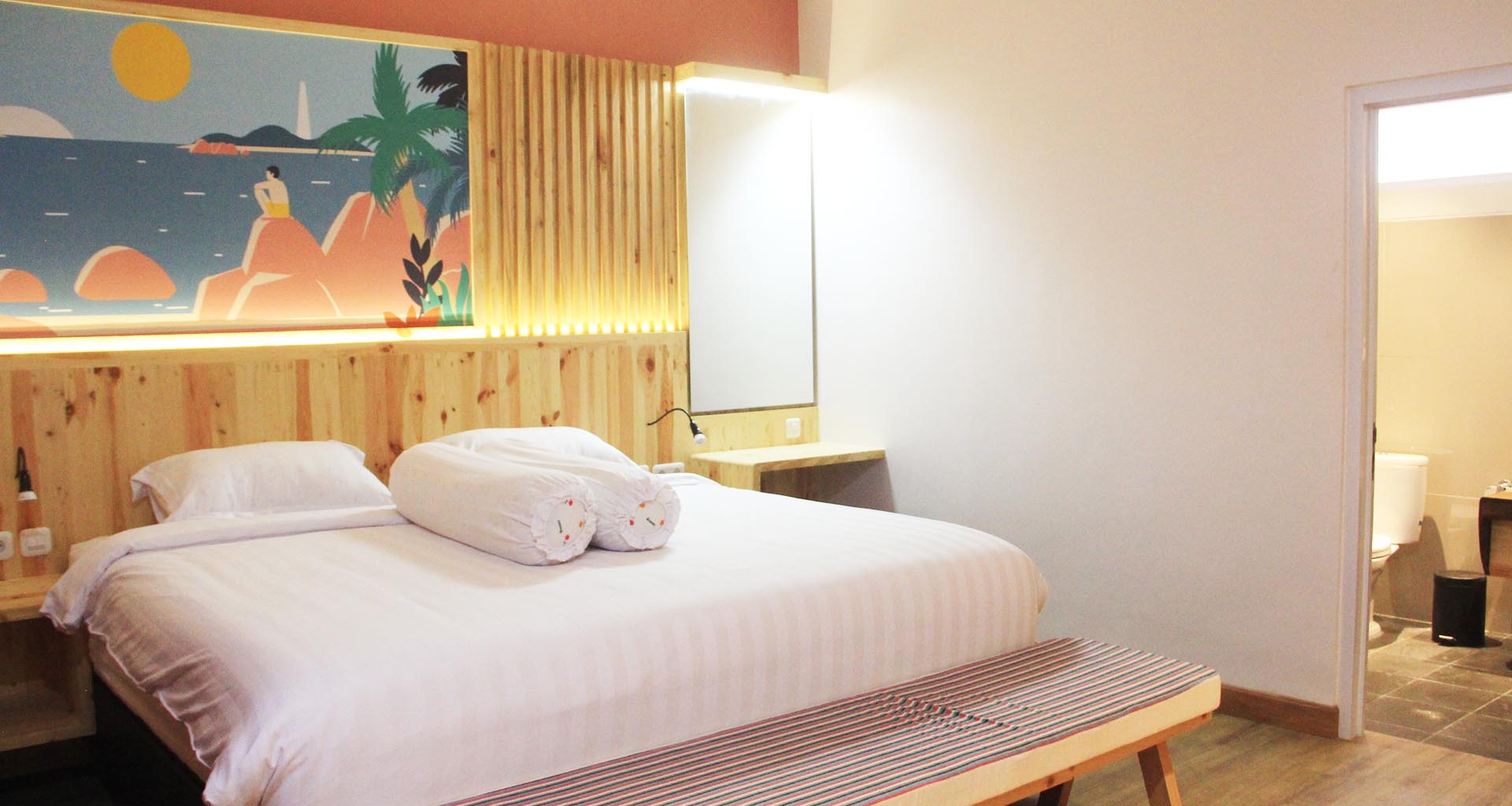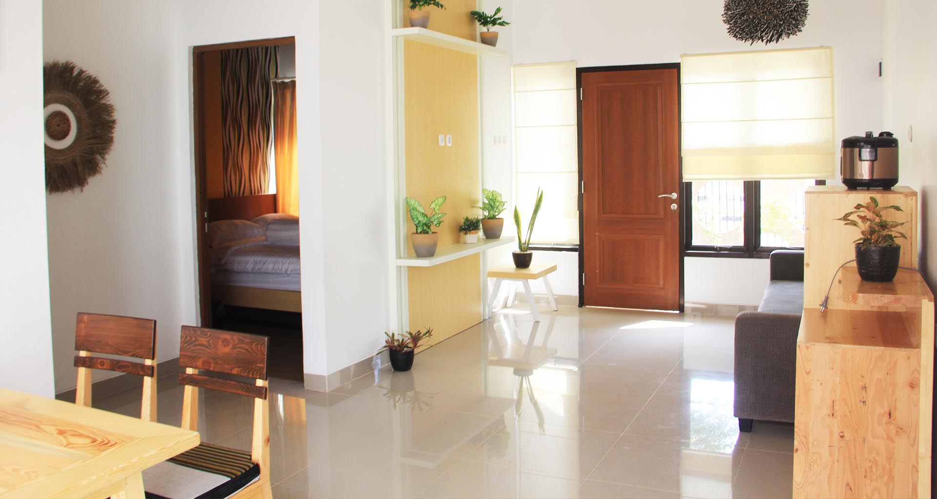 Dalam eksekusinya, MIMO Design Studio menggunakan kayu jati belanda sebagai material furniturnya untuk membawa kesan kesederhanaan yang membuat tamu merasa familiar. Material yang digunakan juga merupakan kayu re-used, yang dapat membantu meminimalisir dampak ekologis.